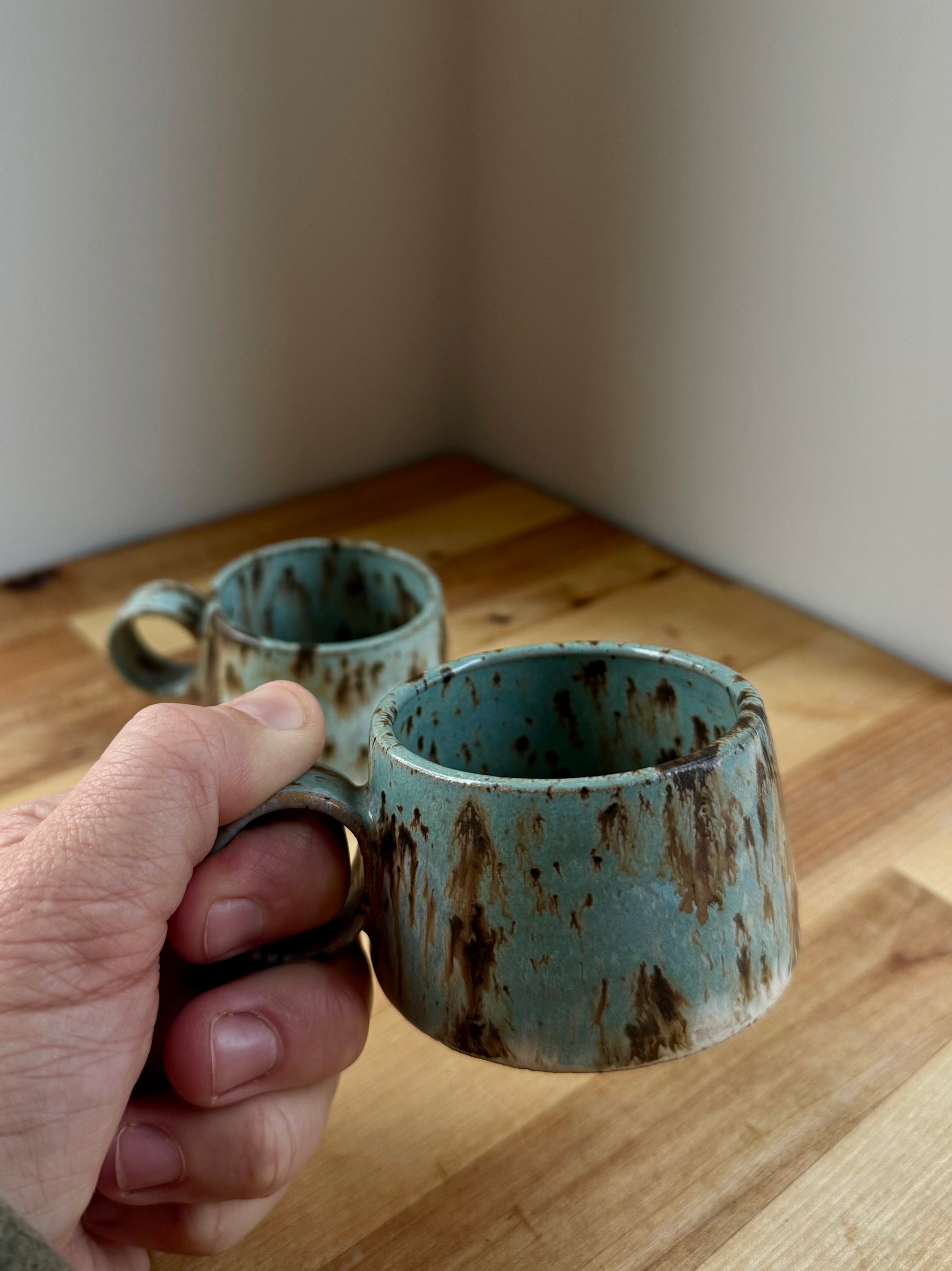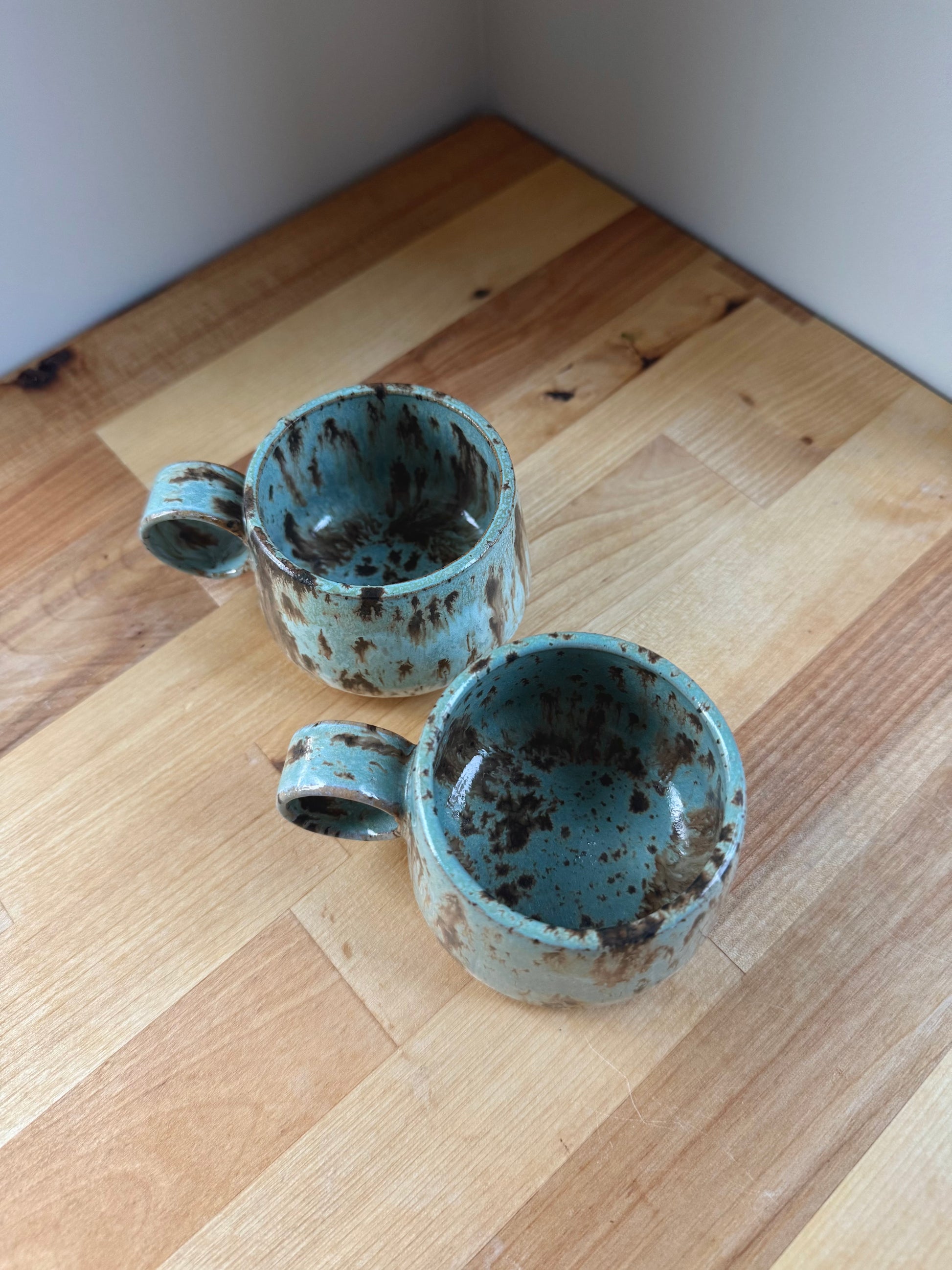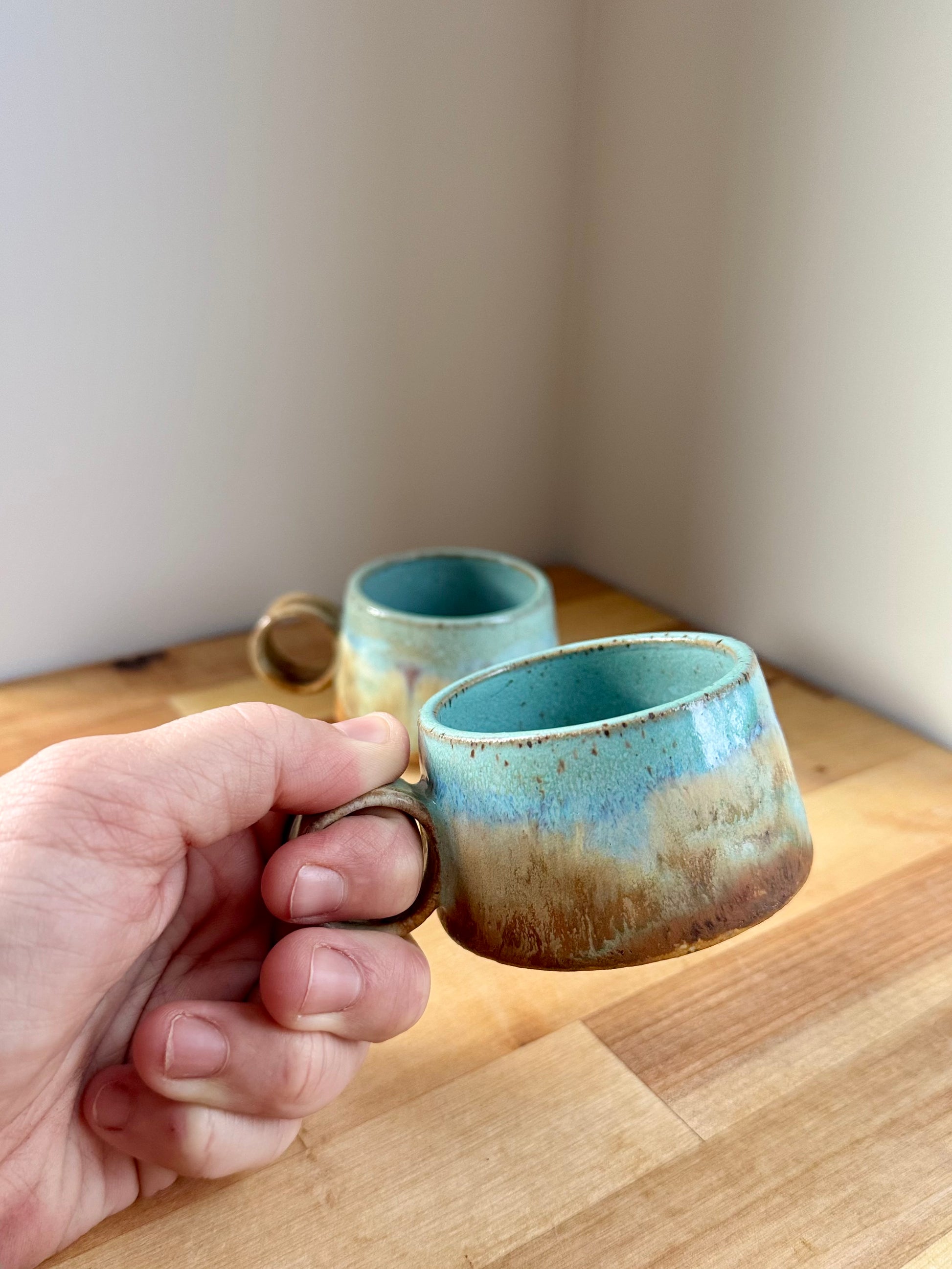 This Halo Espresso Set includes two wheel-thrown mugs, finished by hand in my Flagstaff studio. Designed for espresso or short pours, each piece features the signature halo handle for a balanced, comfortable grip.