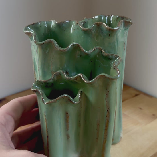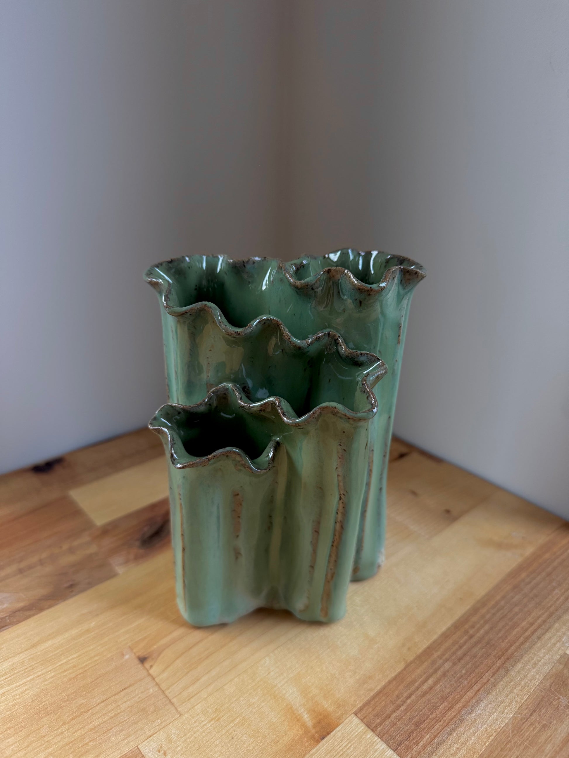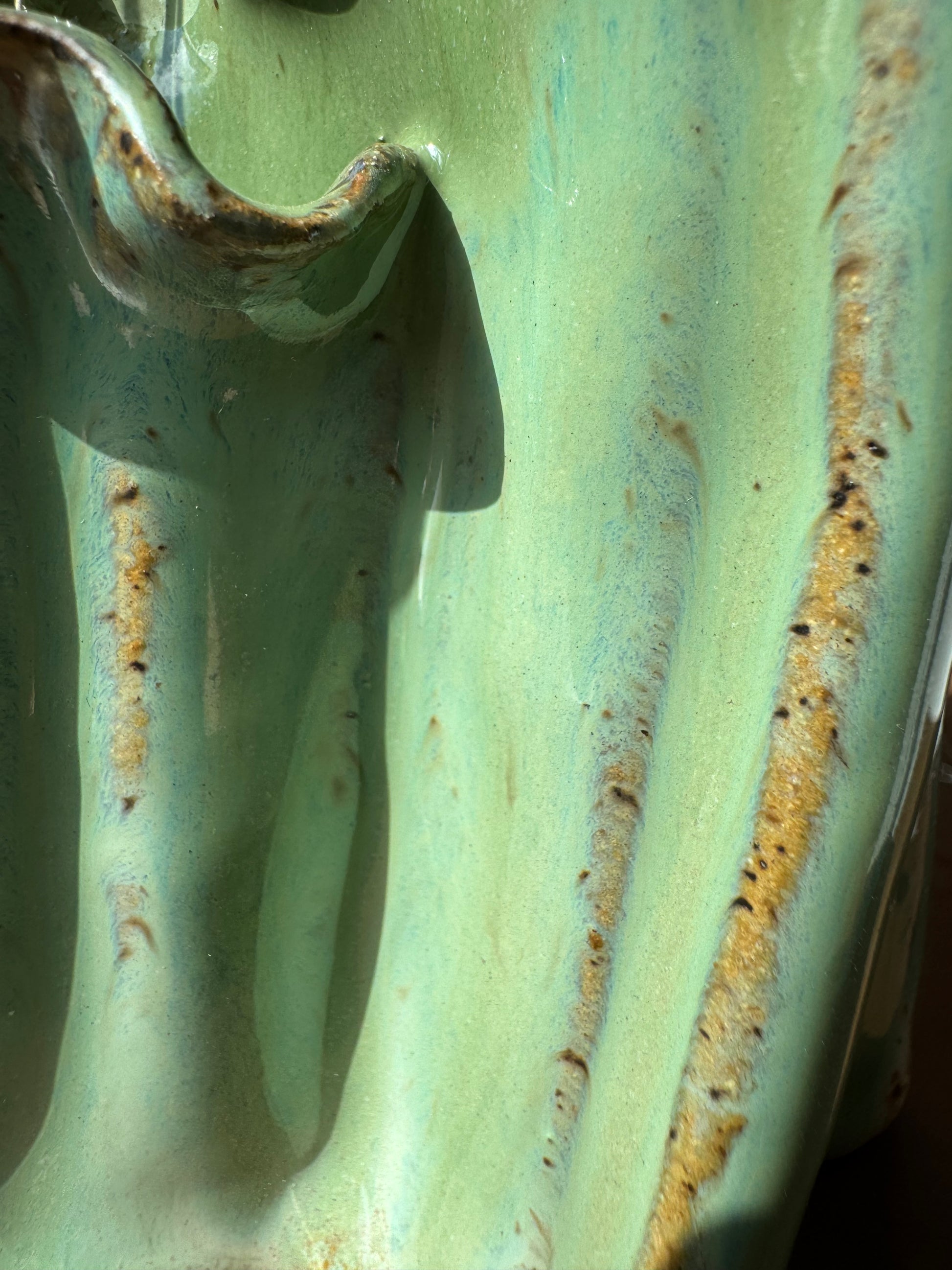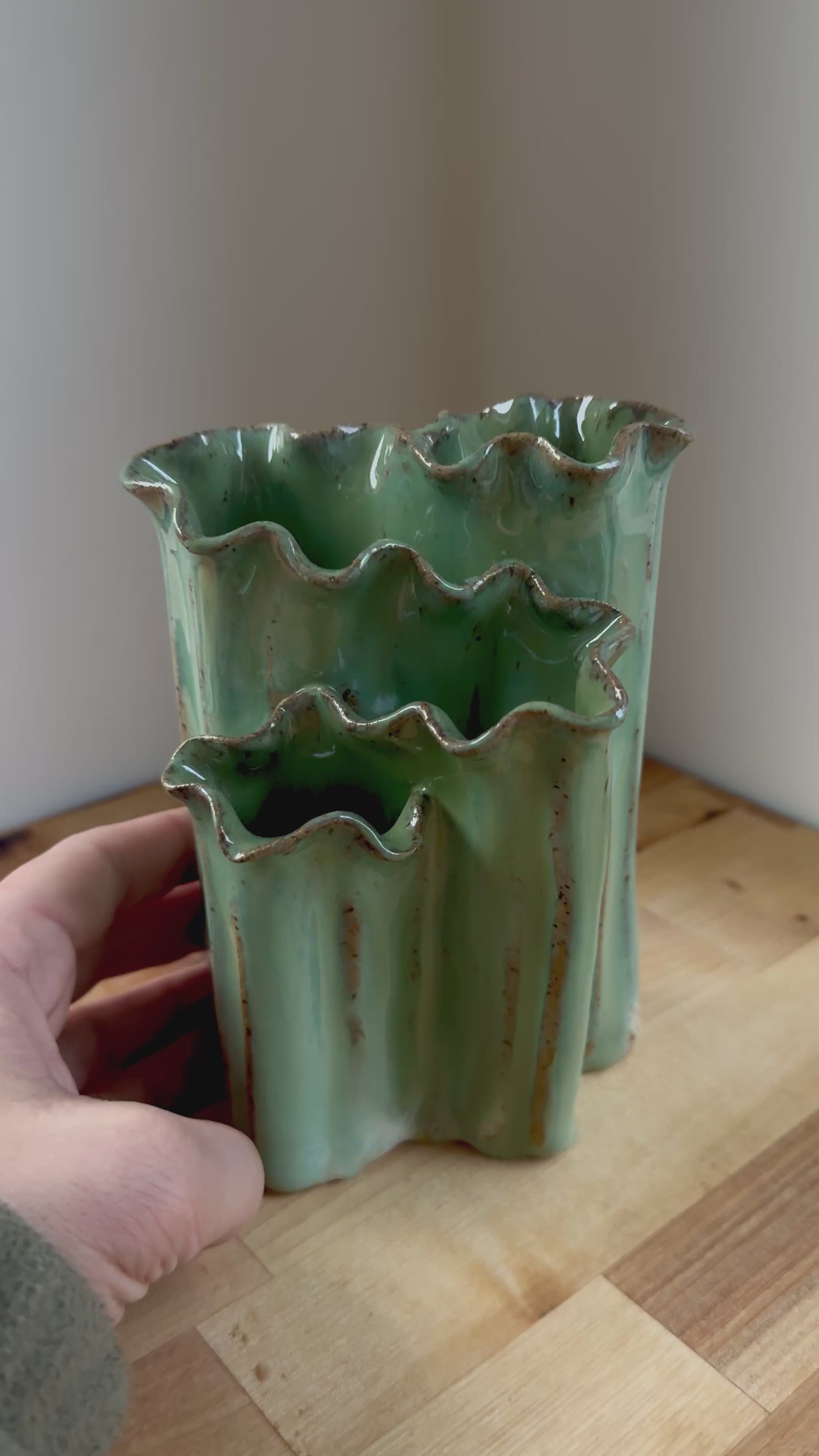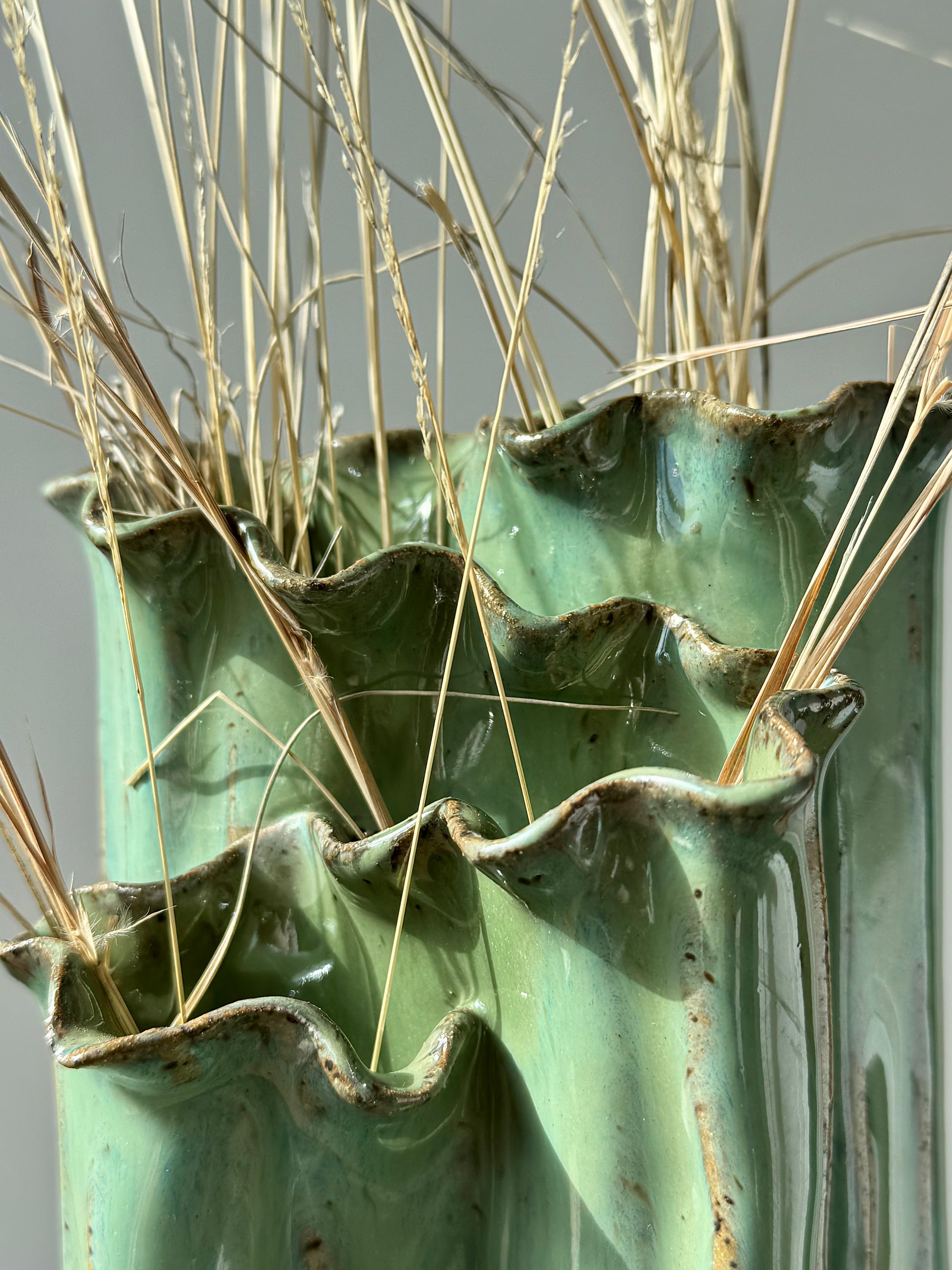 The layered folds allow glaze to settle differently across each surface during firing, creating subtle variation in tone and texture. Slight asymmetry is part of the handmade character and evidence of the process.